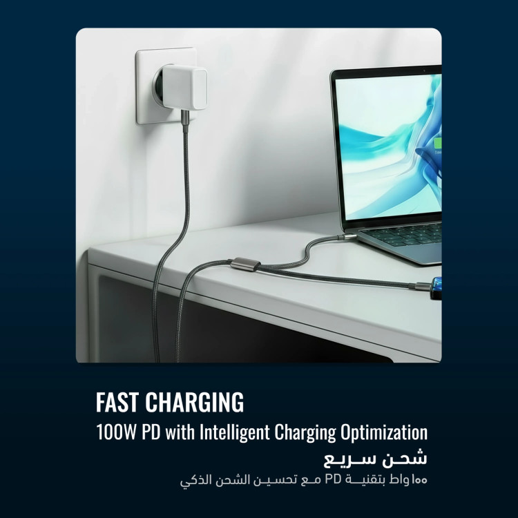کابل شارژ: ولتاژ و شدت جریان خروجی 20V/5A جنس الیاف بافته شده قابلیت انتقال دیتا دارد رابط Type-C To Type-C & Type-C طول کابل 120 سانتی متر