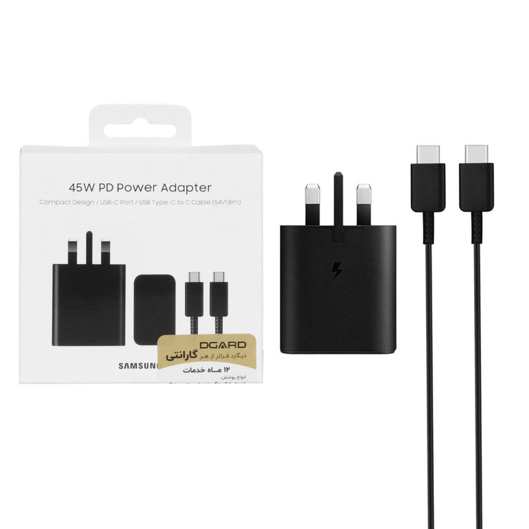 طول کابل همراه 100 سانتیمتر ولتاژ و شدت جریان خروجی کابل همراه 5V/5A رابط کابل همراه Type-C To Type-C نوع درگاه خروجی Type-C جنس بدنه ABS و PC ولتاژ ورودی 240 - 100 ولت توان خروجی 45 وات تعداد درگاه خروجی 1